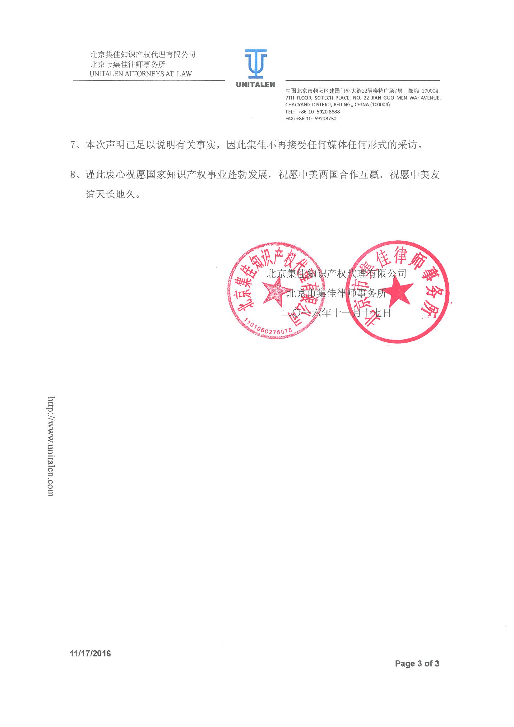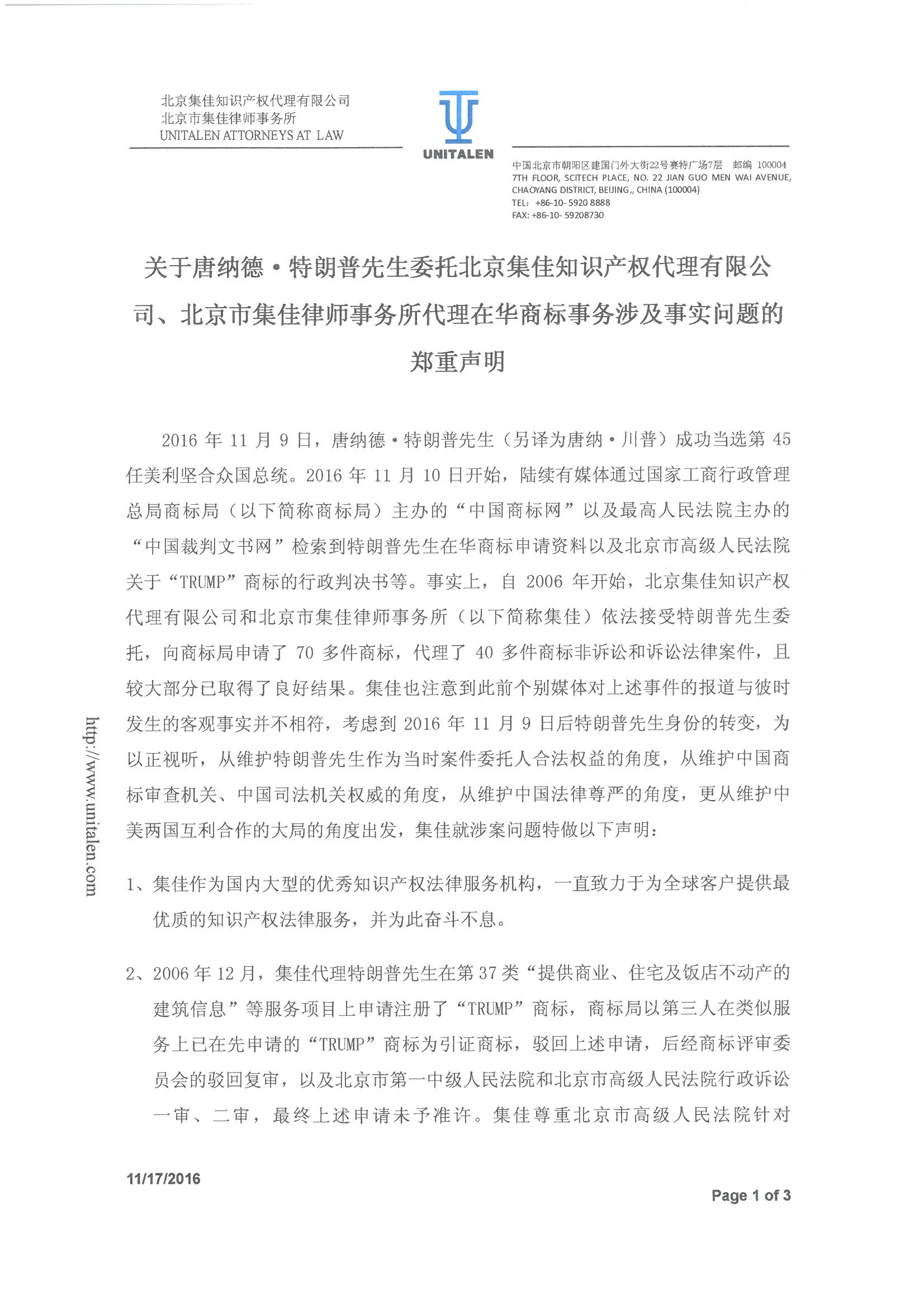 關(guān)于唐納德·特朗普先生委托北京集佳知識(shí)產(chǎn)權(quán)代理有限公司、北京市集佳律師事務(wù)所代理在華商標(biāo)事務(wù)涉及事實(shí)問題的鄭重聲明 .pdf