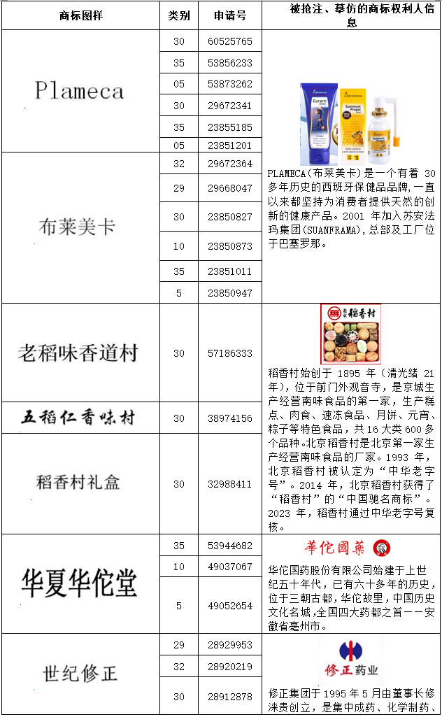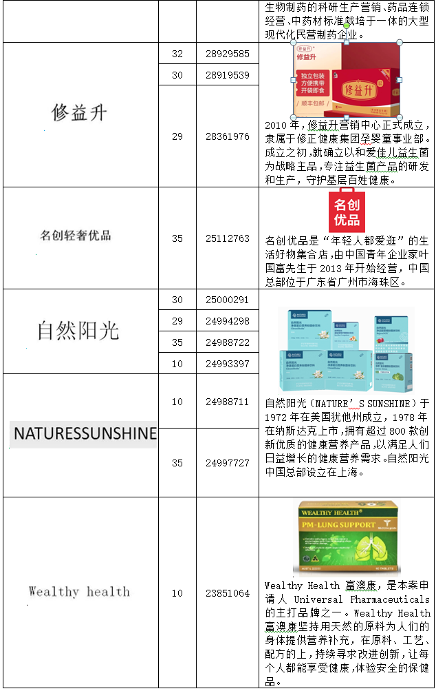 在分析系爭(zhēng)商標(biāo)申請(qǐng)人申請(qǐng)注冊(cè)商標(biāo)之時(shí),需要對(duì)其申請(qǐng)的商標(biāo)進(jìn)行逐一分析、比對(duì),并闡述說(shuō)明被搶注的商標(biāo)的真實(shí)權(quán)利人的情況,并提供參考證據(jù)。如第23851064號(hào)“WEALTHY HEALTH”商標(biāo)無(wú)效宣告案(系爭(zhēng)商標(biāo)申請(qǐng)人共申請(qǐng)156件商標(biāo))中,代理人發(fā)現(xiàn)該商標(biāo)申請(qǐng)人北京鑫鵬福元商貿(mào)有限公司申請(qǐng)的多件商標(biāo)與其他具有強(qiáng)顯著性和知名度的商標(biāo)相同或者近似,且被搶注的商標(biāo)的真實(shí)權(quán)利人根據(jù)查詢均可以一一對(duì)應(yīng)。通過(guò)列表,這些系爭(zhēng)商標(biāo)申請(qǐng)人搶注他人的情況可以很清晰的展示出來(lái)。