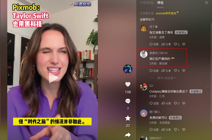 本案中,系爭(zhēng)商標(biāo)被系爭(zhēng)商標(biāo)申請(qǐng)人申請(qǐng)?jiān)诘?1類商品上,同時(shí)系爭(zhēng)商標(biāo)申請(qǐng)人同時(shí)也生產(chǎn)發(fā)光手環(huán)商品,與申請(qǐng)人處于同一商業(yè)領(lǐng)域。系爭(zhēng)商標(biāo)申請(qǐng)人僅申請(qǐng)了9枚商標(biāo),數(shù)量較少。在調(diào)查系爭(zhēng)商標(biāo)申請(qǐng)人行動(dòng)之時(shí),代理人發(fā)現(xiàn)系爭(zhēng)商標(biāo)申請(qǐng)人的關(guān)聯(lián)公司在抖音社交媒體關(guān)于國(guó)際巨星、歌手Taylor Swift(泰勒斯威夫特)的演唱會(huì)上使用申請(qǐng)人的PIXMOB發(fā)光手環(huán)的視頻下面(見(jiàn)下圖),主動(dòng)聲稱該手環(huán)為其公司生產(chǎn)制造。代理人立刻對(duì)該證據(jù)進(jìn)行了固定。