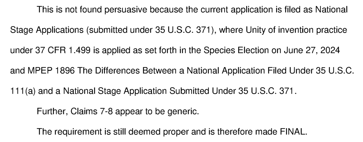 MPEP § 803 規定“If the search and examination of all the claims in an application can be made without serious burden, the examiner must examine them on the merits, even though they include claims to independent or distinct inventions”,即,如果可以在沒有嚴重負擔的情況下對申請中的所有權利要求進行檢索和審查,則審查員必須根據案情對其進行審查,即使它們包括獨立或不同發明的權利要求。如果申請人對RR的回復是帶有爭辯的(with traverse),該爭辯可以保留未來對RR進行申訴的權利,且審查員需要對該爭辯做出回應。這樣的回應可能是審查員同意撤回RR,然而,更可能的是審查員發出Final RR,維持前次的RR意見,審查員通常在Final RR中僅對RR的理由稍作調整。