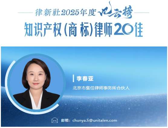 集佳合伙人李春亞律師榮登“律新社2025年度風云榜:知識產權(商標)律師20佳”榜單
