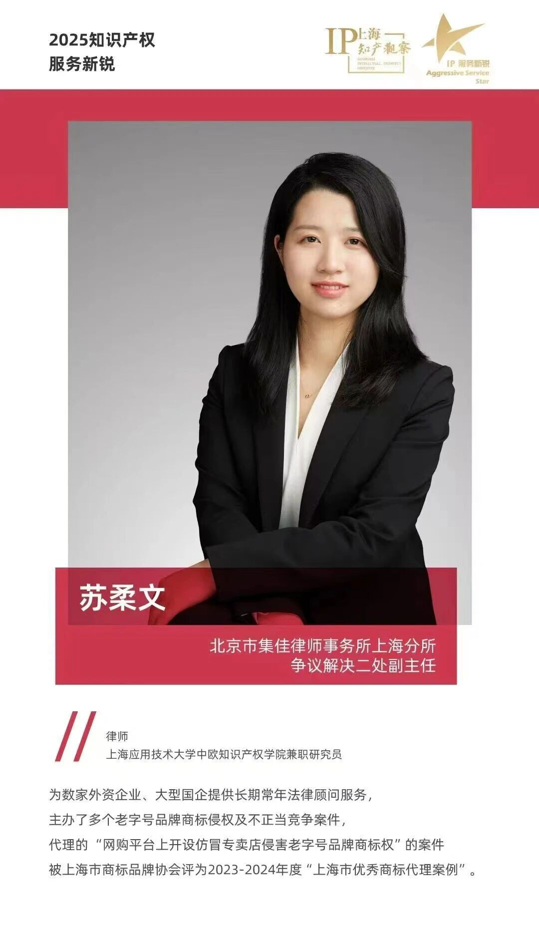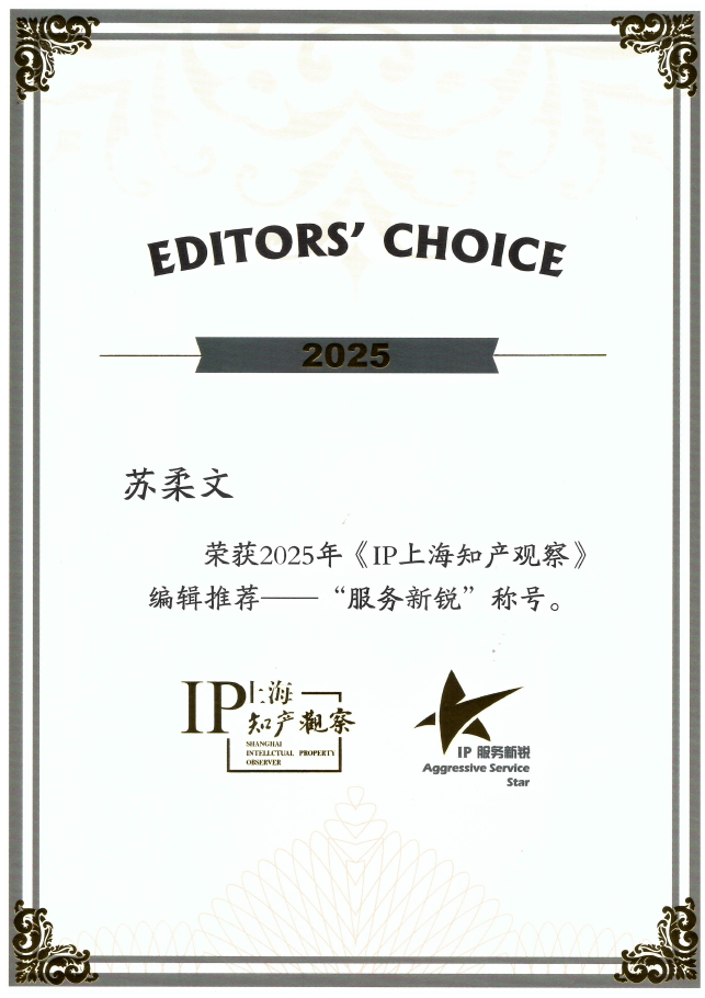 集佳上海分所蘇柔文律師憑借優秀的專業素養與突出的業務表現獲評“2025知識產權服務新銳”。